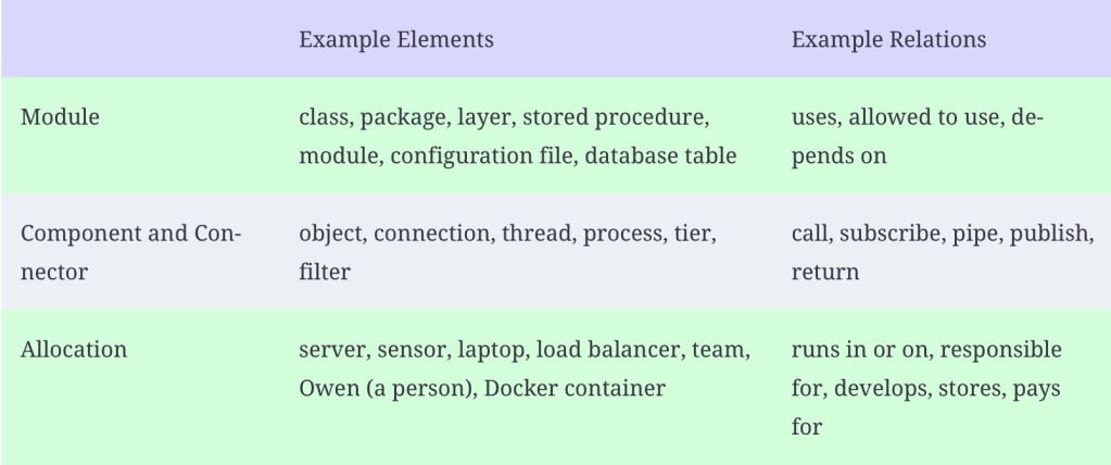 First, we need a basic framework to name the parts of the system so we can separate the functionality of pieces of the software. One way to call the parts is: 1) module, 2) component and connector (C&C for short), and 3) allocation.